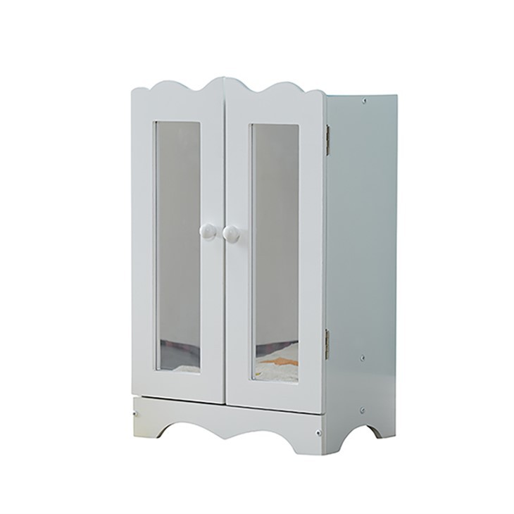 Skříň pro panenky je krásný a elegantní způsob, jak děti uložit oblečení pro panenky. Má ideální velikost pro 18" panenky a vyznačuje se klasickými vroubkovanými hranami a šesti dřevěnými věšáky - krásný doplněk do každého pokojíčku pro panenky. Dvojité zrcadlo je vyrobeno z bezpečného a odolného plastu a dřevěná konstrukce znamená, že malá skříň slibuje roky zábavy.